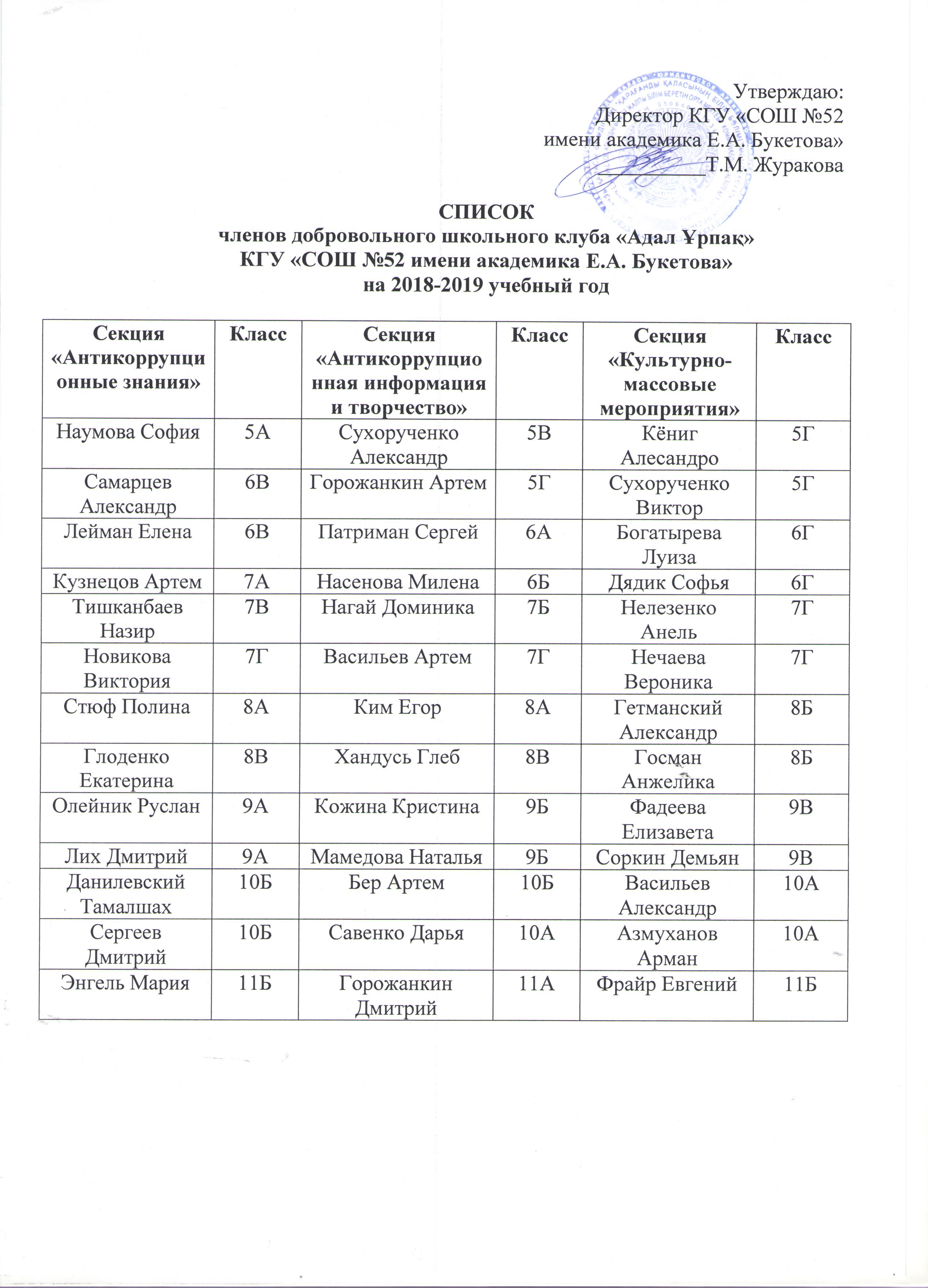 Список членов добровольного школьного клуба "Адал Ұрпақ" на 2018-2019 учебный год05.03.2019 |