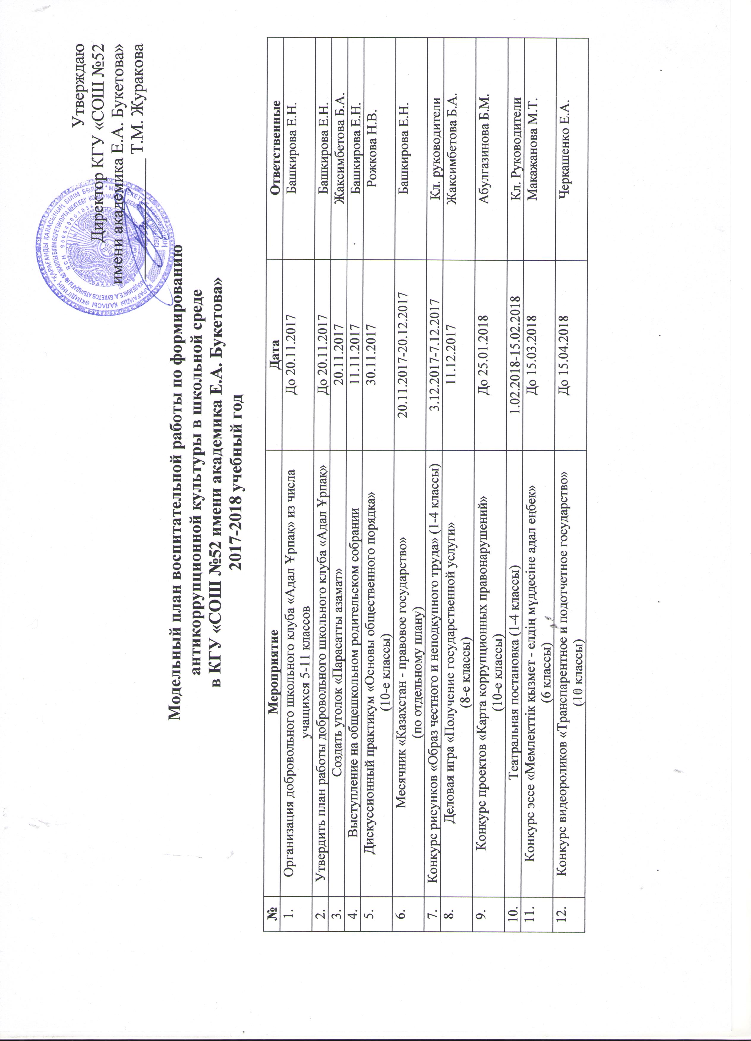 Модельный план воспитательной работы по формированию антикоррупционной культуры в школьной среде в КГУ "Общеобразовательная школа имени академика Е.А. Букетова" на 2021-2022 учебный годМодельный план воспитательной работы по формированию антикоррупционной культуры в школьной среде в КГУ "Общеобразовательная школа имени академика Е.А. Букетова" на 2021-2022 учебный год |