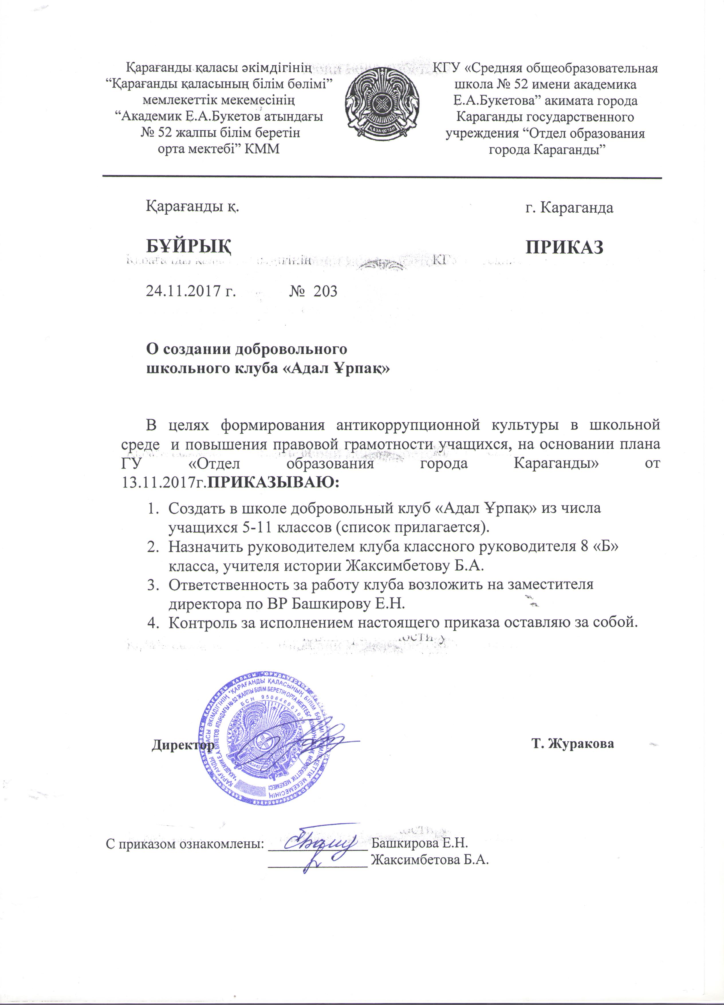 Приказ №203 от 24.11.2017 года "О создании добровольного школьного клуба "Адал Ұрпақ""05.03.2019 |