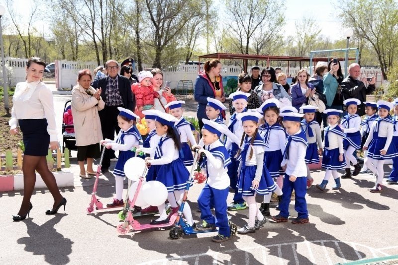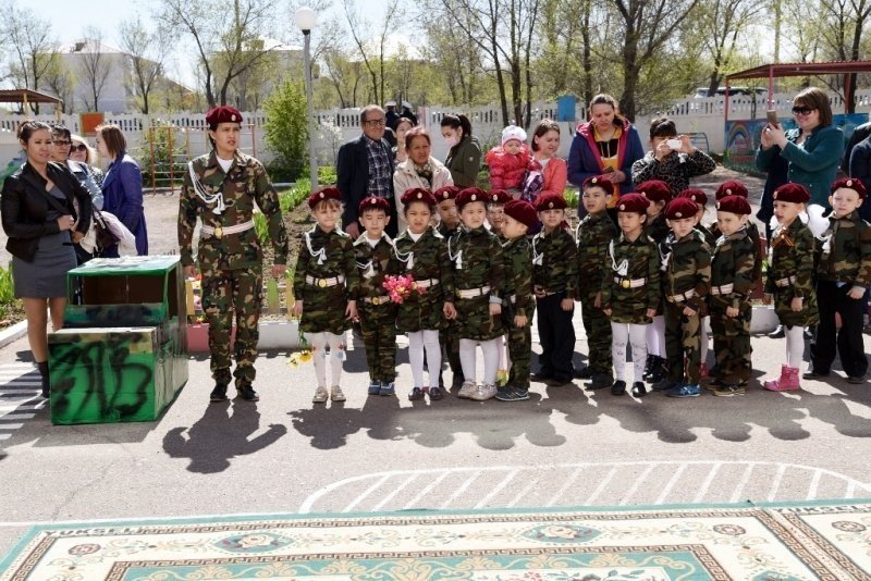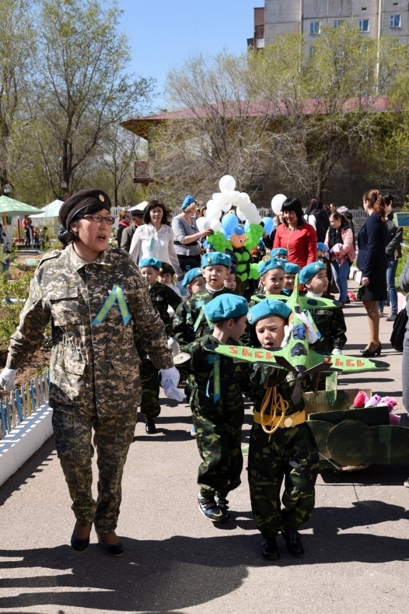Шеруге балабақшаның 350 тәрбиленушісі қатысты.Әрбір топ әскери ерекшелікті танытты:шекарашылар, танкистер, теңізшілер,ұшқыштар. Әскерлермен бірге жаңа "әскери техникалар" өтті. Барлық "сарбаздар", "жаңа киім нысанын" көрсетті. Балабақша жасақтары патриоттық әндерімен сапқа тұрып рәсімге сәйкес "Мәңгілік алау" монументіне гүл шоқтарын қойды. Мектепке дейінгі балалар Жеңіс күніне арналған салтанатты жиынға "Бір минут үнсіздікпен" қаза болған солдаттарды еске алып, оларға арнап өздерінің өлеңдерін оқыды. Мерекелік шара көтеріңкі "Ура!" деген дауыспен және мерекелік отшашулармен аяқталды!