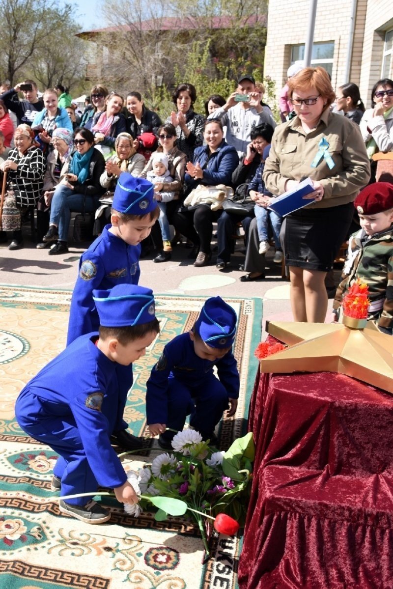 Мерекеге "Гүлдер" ықшам ауданының соғыс ардагерлері мен еңбек адамдары және ата-аналар шақырылды. Барлық қонақтарға педагогтар ансамблі мен балабақша тәрбиеленушілері "Қаза болғандарды еске алу..."атты әдеби-музыкалық іс-шараны арнады.Шеруден кейін барлық балалар мен ата-аналар "Сарбаздар"атты әскери-спорттық жарыстарды көрді.