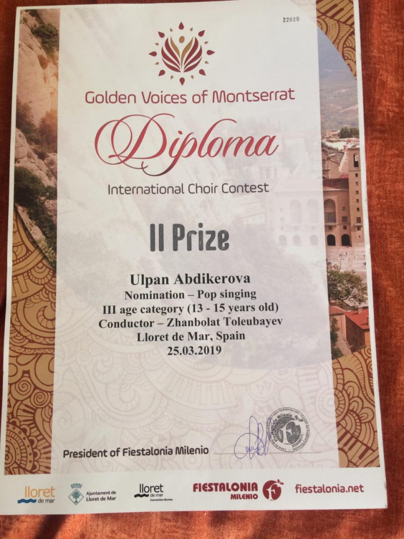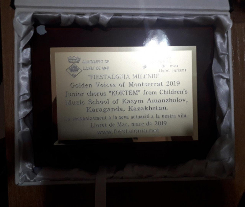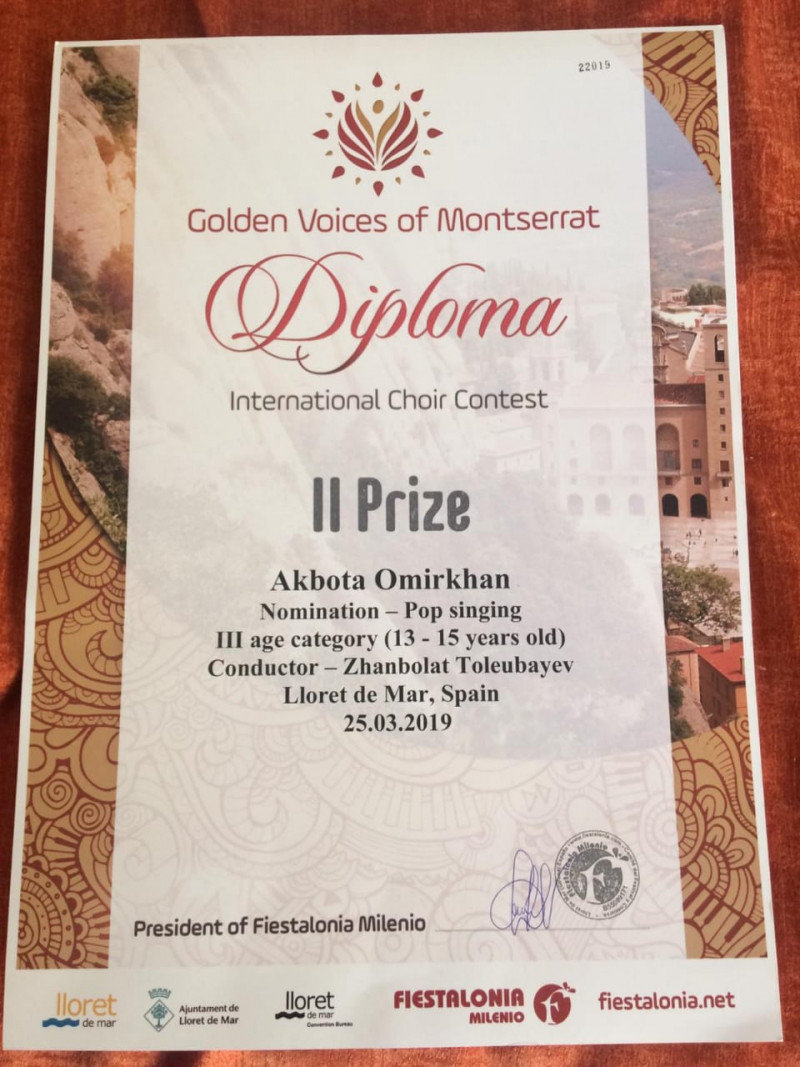 2019 жылы 28 наурызда алғаш рет Қасым Аманжолов атындағы музыка мектебінің оқушылары Испанияда Ллорет де Мар қаласында " Golden Voices of Montserrat (Монтсеррат алтын дауыстары) хорлар халықаралық конкурсы аясында өнер көрсетті. Жас таланттар өз өнерлеріменИспаниясахналарын баурапалды. Ұсынылған екі топ жүлделі 3 орынға ие болды, сондай-ақ 10 вокалистан 2 вокалист 2 дәрежелі дипломдармен марапатталды.