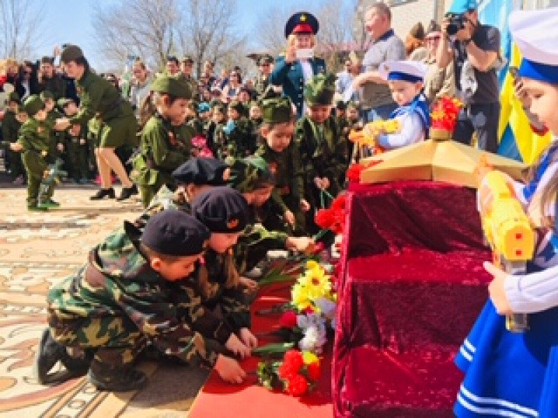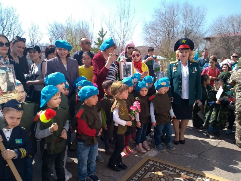 Отряды маршировали со строевыми песнями, речевками по плацу детского сада, пронесли фотографии «Бессмертного полка», приняли участие в возложении цветов к детскому монументу «Вечный огонь», почтили «Минутой молчания» павших солдат во время войны и посвятили им свои стихи, песни, танцы.