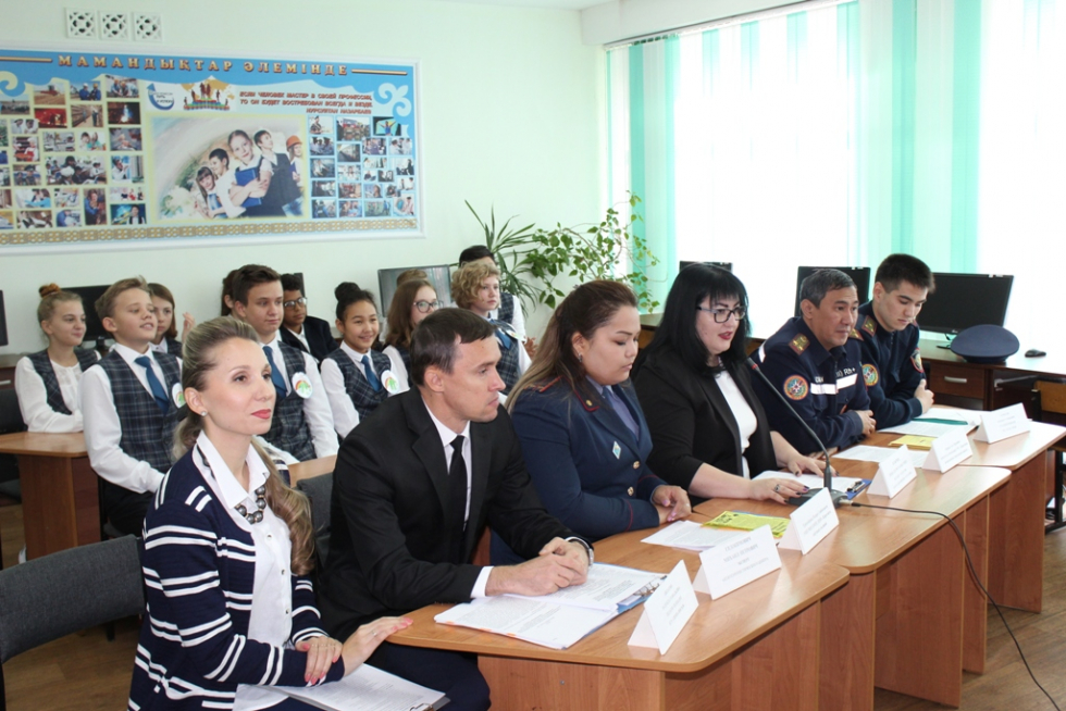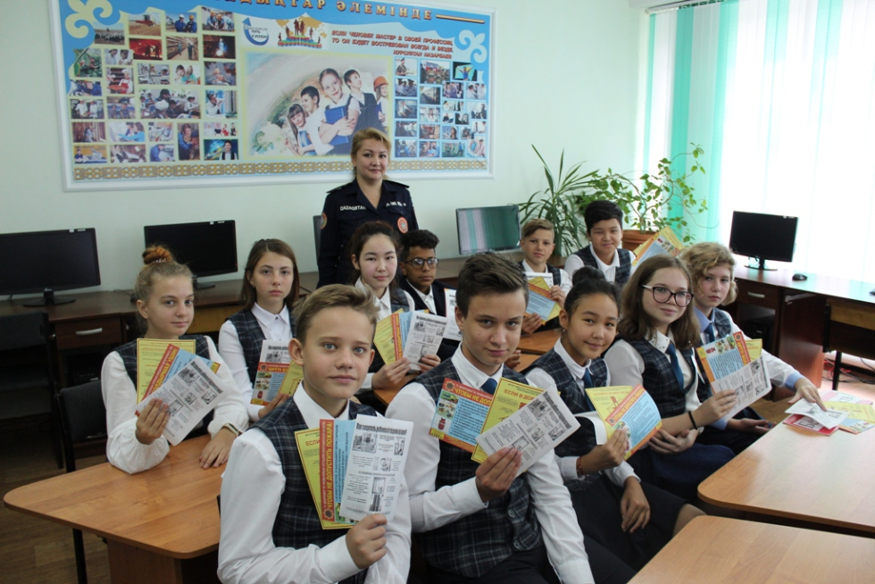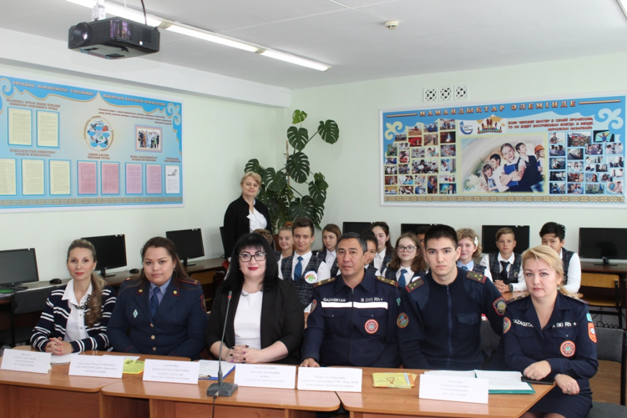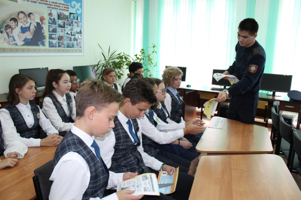 Перед учащимися выступил заместитель начальника УЧС г. Караганды подполковник гражданской защиты Омаров Ахат Оразович с информацией по правилам пожарной безопасности, а также по профилактике детского травматизма при выпадении детей из окон, падении в открытые колодцы выступил старший инженер УЧС Курметов Жамбыл Серикович.