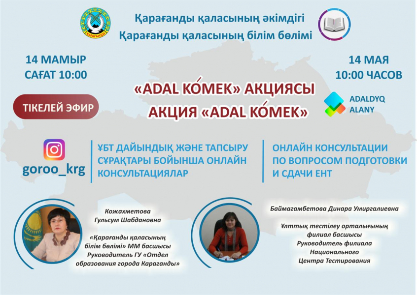 Қарағанды қаласы білім бөлімінің басшысы Г. Ш. Қожахметова және ҰТО филиалының басшысы Д. У. Баймағамбетова 2020 жылы 14 мамыр күні сағат 10:00-де @goroo_krg паракшасында online режимінде сұрақтарыңызға жауап береді.