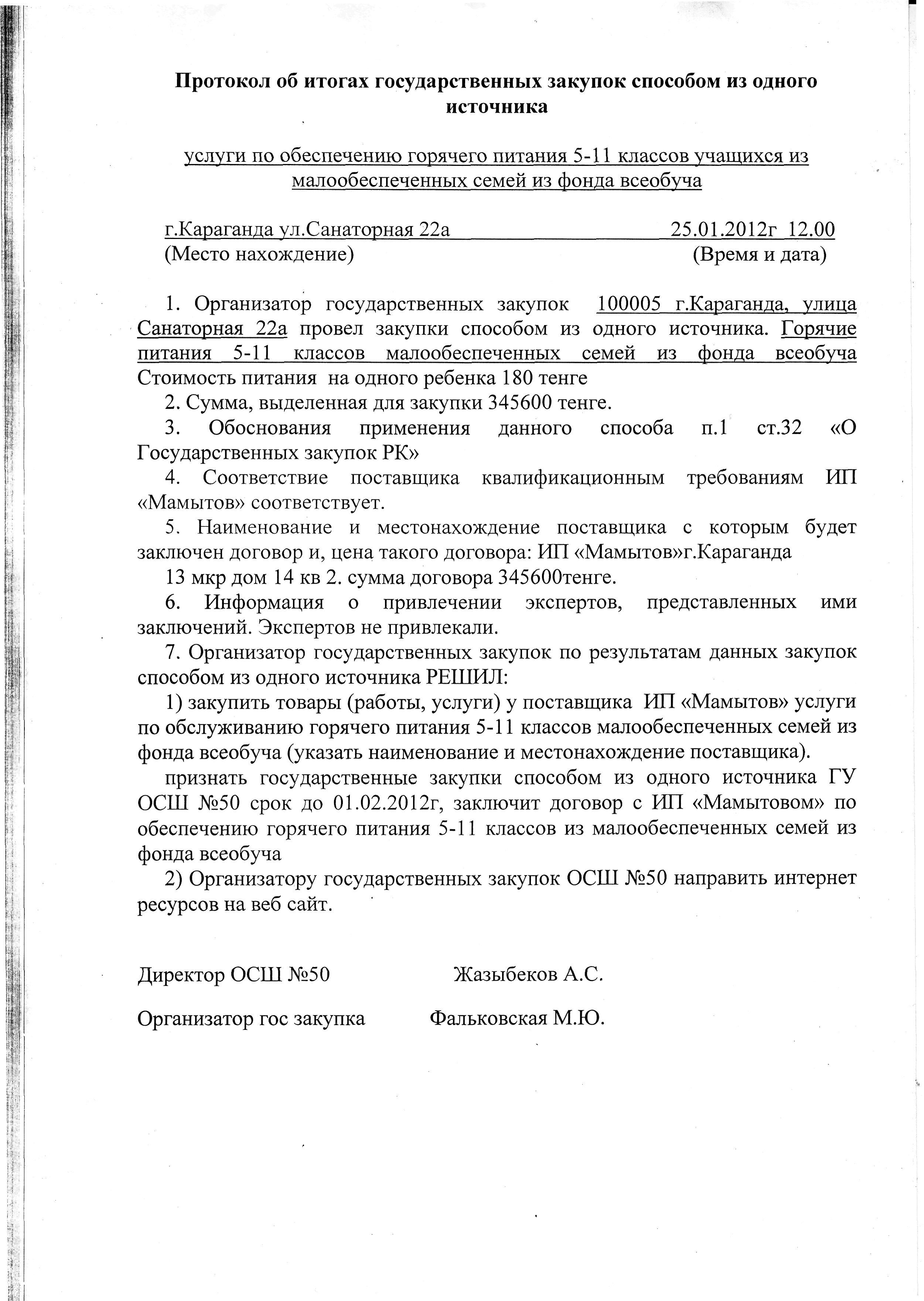 Название конкурса: Протокол по обеспечению горячим питанием 1-9 классов учащихся из малообеспеченных семей и фонда всеобуча