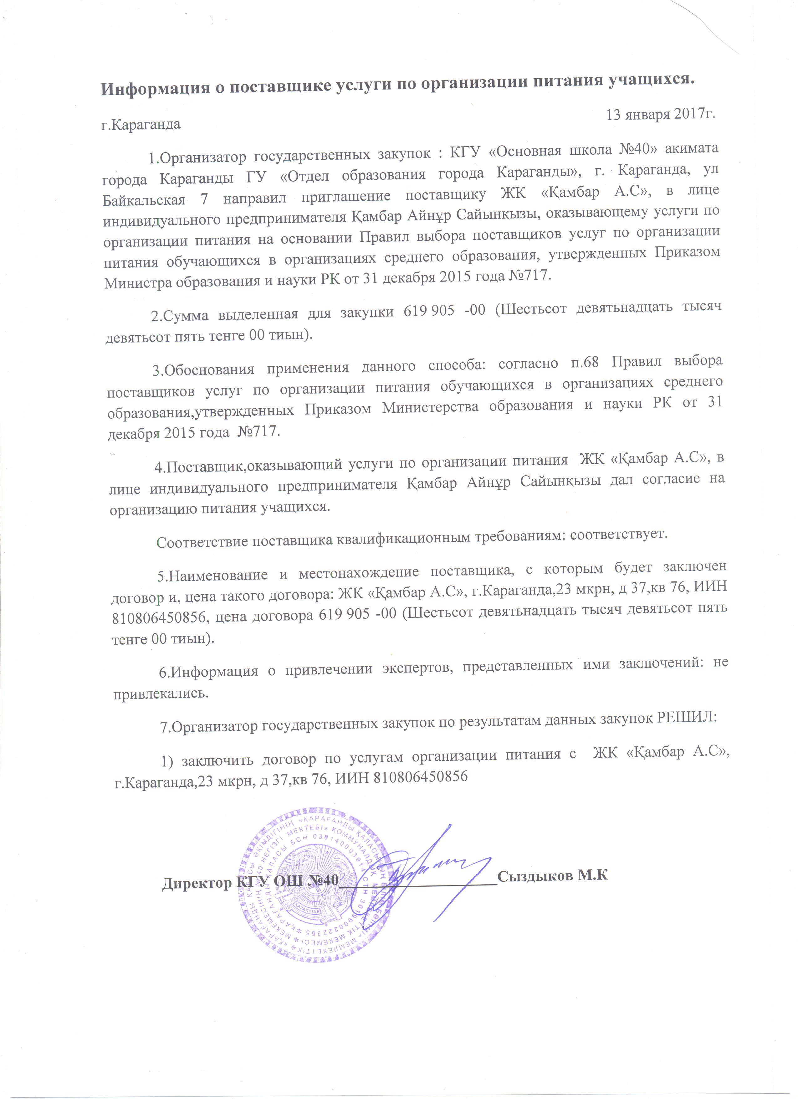 Название конкурса: Информация о поставщике услуги по организации питания учащихся.